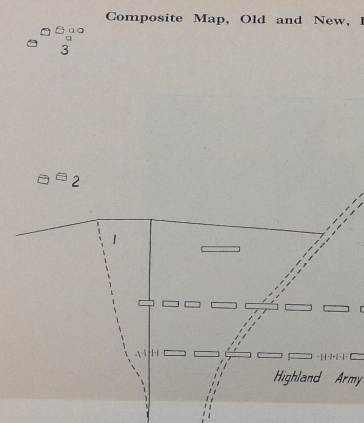 Then yesterday, I was idly flipping through material on the bookshelves and happened upon a little one shilling booklet printed called Culloden Moor and Clava Circles. In it I came across a fold out map of the battlefield as drawn in 1746 by the military in command that day. And lo and behold, some wee cottage dwellings were drawn in, a number 3. by them designating them as dwellings of the Balvraid [Balvaird] Farm. And another two dwellings with the number 2. beside them designating them as the Culchunaig Farm.