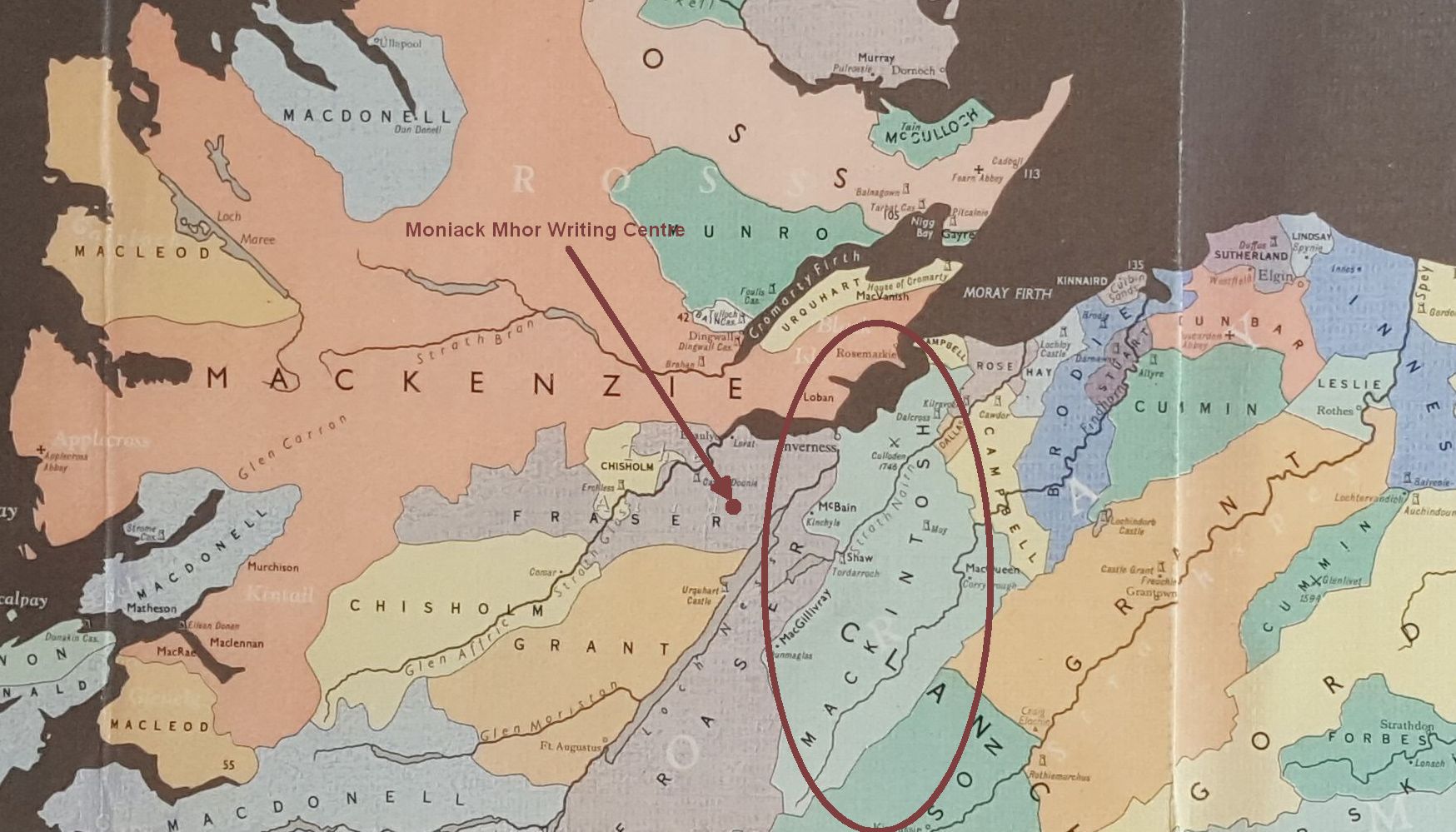 On the map, the Mackintosh clan laid claim to the upper shoulders of the witch, just beneath her head. Where all the muscular tension resides, come to think of it. The territory of the former site of the fateful 1746 Battle of Culloden.