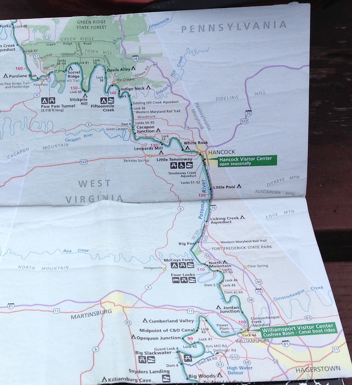 Angela and I have been using several methods to keep our spirits up regarding the journey ahead. The trail has mile markers, so we keep track of those (we’ve now reached mile 124, at Hancock). Another is to count folds on the map. We’ve now made it  past the fourth fold.